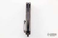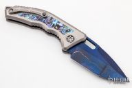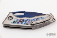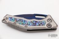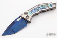 This Medusa by Heretic Knives features a Blued Damascus multi-ground tanto blade with false top edge, notched thumbrest. The handle has a two-tone titanium frame with abalone inlays, checkered push button, two-tone titanium backspacer and a tip up clip with ceramic ball. Comes with original box, COA, zippered case and drawstring bag.  S/N 008 and dated 06/19.  Excellent Condition.