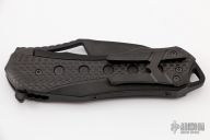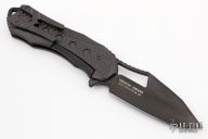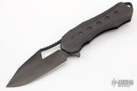 This Osiris by Heretic features a battleworn DLC finished blade with notched thumbrest, thumbhole and flipper. The handle has a DLC titanium frame with carbon fiber inlays, tip up matching titanium clip. Rides on bearings, nice detent, lockup and blade seating. Prototype #007 and dated 08/2019. Comes with original box, zippered case and COA. Excellent condition.