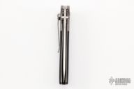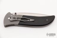 This Cujo D/A by Larry Chew features a satin finished blade with swedge and dual thumbstuds. The handle has bead blasted and dovetailed titanium bolsters, carbon fiber scales, bead blasted titanium liners, bead blasted stainless steel spring/backspacer, tip down bead blasted titanium clip. Offers both fast leaf-spring automatic action and smooth manual action. Nice detent, lockup, action and blade seating. Nice function. Comes with zippered case. Has a few light scuffs, otherwise excellent condition.