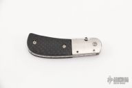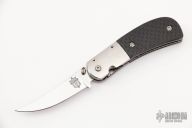 This Small Persian D/A Bolster Release by Doc Hagen features a mirror polished upswept blade with fileworked spine and single thumbstud. The handle has stainless steel dovetailed bolsters, carbon fiber scales, fileworked titanium liners, and a fileworked and mirror polished stainless steel backspacer. #936 on blade. Comes with leather zippered case. Has some light scratches, otherwise excellent condition.