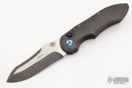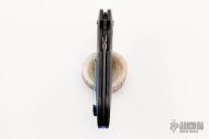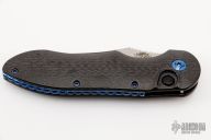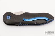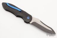 This Blue Max Auto by Jerry Moen features a satin and acid tumble finished blade with notched thumbrest. The handle has a carbon fiber frame, tumbled and anodized titanium backspacer and a tip up clip with hidden screws, has blue anodized titanium hardware. Rides on bearings. Nice lockup and blade seating. Comes with nylon zippered case and COA. Excellent condition.