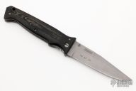 This 1993 Soldier of Fortune Knife by Butch, Rainy and Shawn Vallotton features a bead blasted clip point blade with a checkered thumbstud and false top edge. The handle has black linen micarta scales, bead blasted stainless steel liners and backspacer. Nice detent, lockup and blade seating. SOF-93 #42 of 50 on blade. Has some light scuffs on the bead blast finishes, otherwise excellent condition. Comes with a zippered case.
