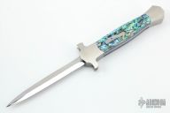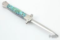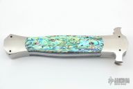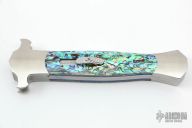 This Prototype Custom Hammer Head OTF by Burn Knives features a mirror polished double-edged blade. The handle has a 416 stainless steel frame with abalone scales. Nice action and lockup. Excellent condition. Comes with a zippered case
