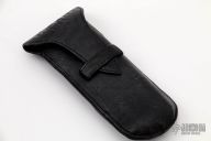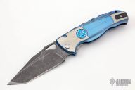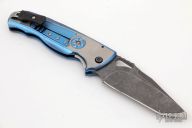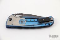 This D/A Auto from Matt Diskin features an acid tumble finished tanto blade with thumbhole and checkered thumbrest. The handle has a two-tone anodized and milled titanium frame, tip up reversible titanium/carbon fiber clip, and a jimped carbon fiber backspacer, stainless steel liner. The wheel on the front scale is the release for the blade, spin it clockwise to fire. Has anodized titanium hardware. This takes a few tries to master, but once you figure it out it is a very interesting design. Nice detent, lockup, action and blade seating. Excellent condition. Comes with a zippered case.