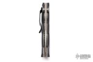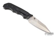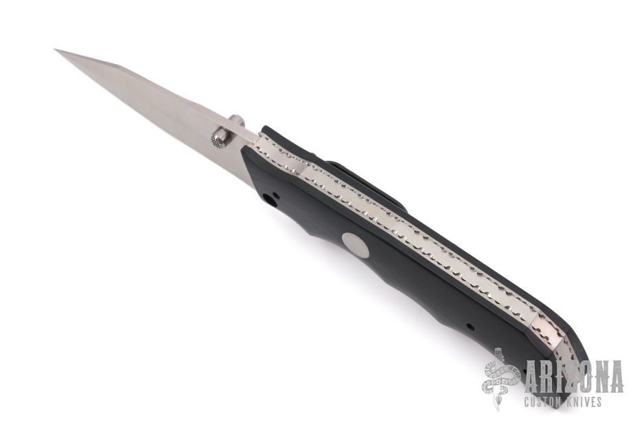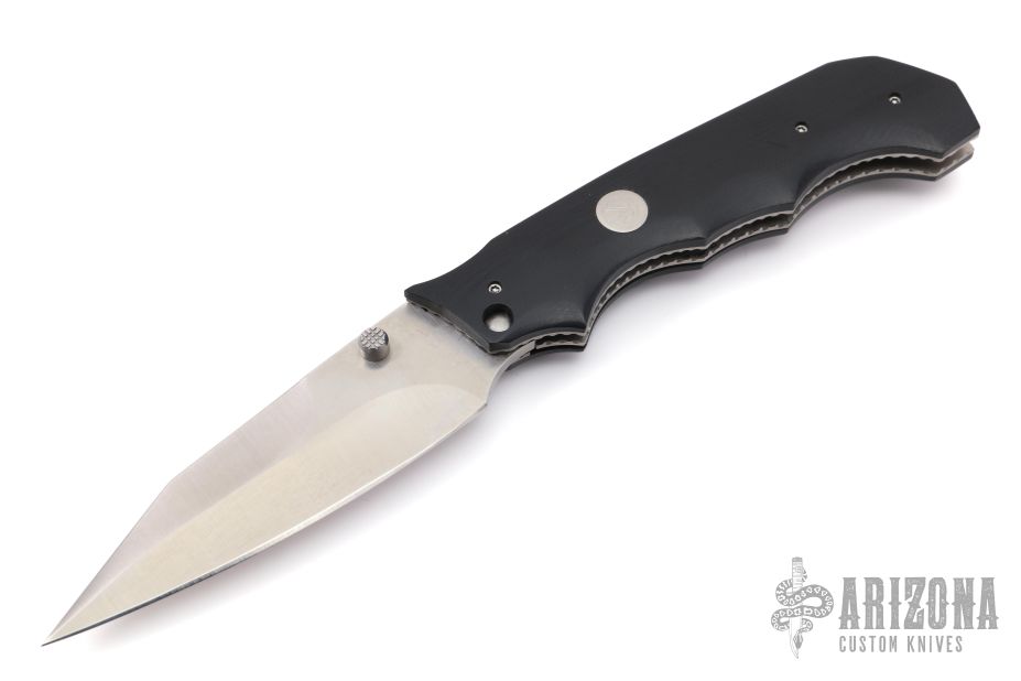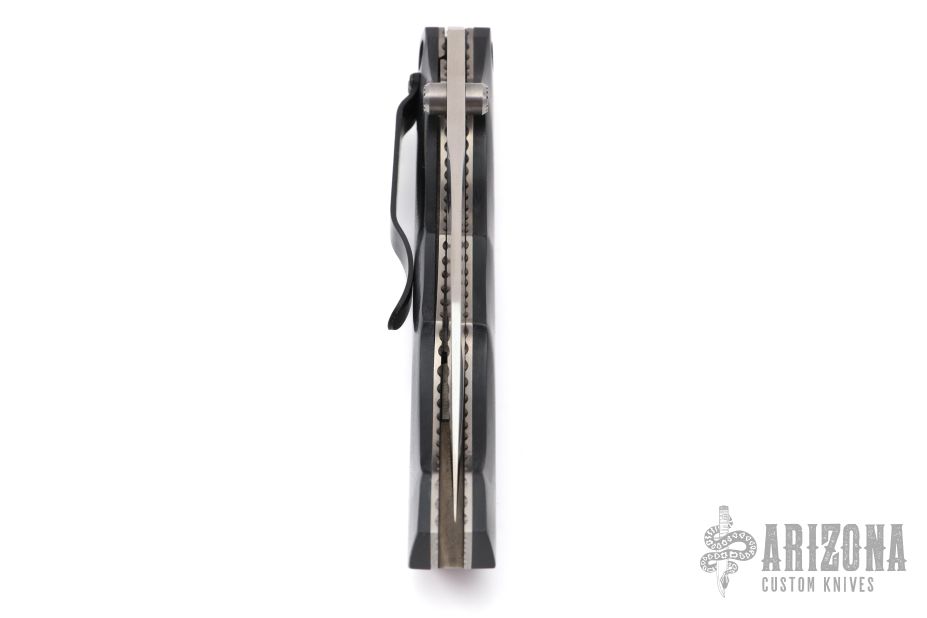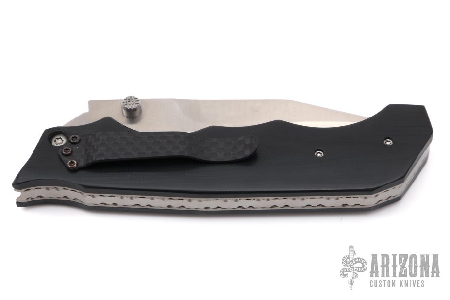 This "The Elite Few" D/A Auto by Brandon Vallotton features a satin finished blade with dual thumbstuds. The handle has black G-10 scales, fileworked titanium liners, fileworked stainless steel backspacer, tip down carbon fiber clip. Nice detent, action, lockup and blade seating. Comes with a nylon belt sheath. Excellent condition. Comes with COA.