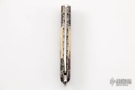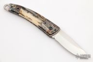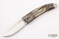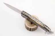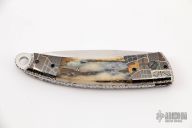 This Scale Release Auto by Wayne Whittaker features a high satin drop point blade. The handle has mosaic Damascus double bolsters, mammoth ivory scales, fileworked titanium liners and a fileworked stainless steel backspacer with matching lanyard bail. Comes with a nylon belt sheath. Nice action, lockup and blade seating. Some minor scuffs on blade, but otherwise excellent condition.