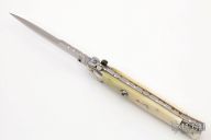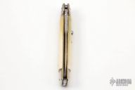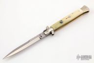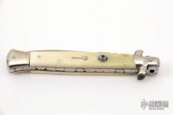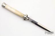 This Swivel Bolster by Latama features a bayonet ground blade with false top edge, fileworked spine. The handle is comprised of nickel silver bolsters and pommel with bone scales over brass liners and a fileworked stainless steel backspacer. Excellent condition. Comes with a zippered case.