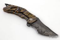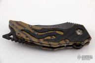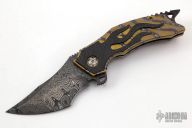 This Tomahawk Prototype #2 by Burn Knives features a Mike Norris Stainless "Gator" Damascus blade with notched thumbrest and flipper. The handle has a flamed titanium frame with carbon fiber overlay and backspacer, brass knuckle overlay, tip up flamed titanium clip with hidden screws and skull overlay. Rides on bearings, has nice detent, has vertical blade play/lock rock, the blade touches the inside of the frame when closed, has a couple light scratches, otherwise good condition. Comes with a zippered case and COA dated 5-6-20