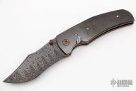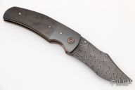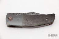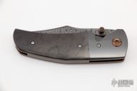 This Freelancer by Ranger Made Knives features a Damascus clip point recurve blade with single thumbstud.   The handle has zirconium bolsters, carbon fiber scales, anodized titanium liners with jeweled interiors, zirconium backspacer. Nice detent, lockup and blade seating. Excellent condition.