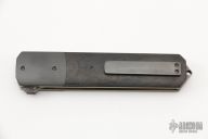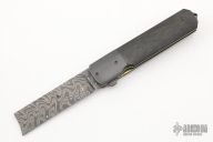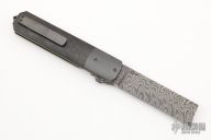 This Razor flipper from Jason Clark features a Damascus "straight razor" like blade with a "Spanish Tip" and checkered flipper. The handle has dovetailed zirconium bolsters, carbon fiber scales, titanium liners, San Mai Damascus backspacer, tip up zirconium pocket clip. Nice detent, lockup and blade seating. Very nice flipping action (IKBS). Excellent condition.