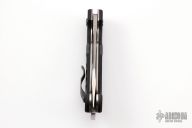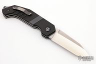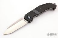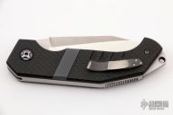 This One Off Scale Release Auto by Phil Booth features a satin finished clip point tanto blade. The handle has carbon fiber scales with a gray G-10 band, titanium liners and a stainless steel backspacer.  Tip up titanium pocket clip. Nice lockup, action and blade seating. Comes with a zippered case. Excellent condition.