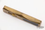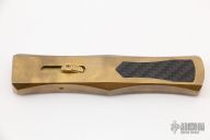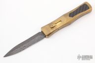 This Custom Steelhead OTF by Burn Knives features a Damascus double-edged blade. The handle has a satin finished brass frame with carbon fiber inlay and milled thumbslide. This knife is sterile with no markings, the consignor said it is the Prototype. Nice action and lockup. Has a couple light scratches, otherwise excellent condition. Comes with a zippered case.