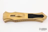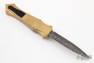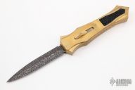 This Custom Stingray Prototype OTF by Burn Knives features a Damascus double-edged blade. The handle has a satin finished brass frame with fileworked center spacer, stingray skin inlay and milled thumbslide. This knife is marked Proto and Burn under the thumbslide, the consignor said it is the Prototype. Nice action and lockup. Has a couple light scratches, otherwise excellent condition. Comes with a zippered case.