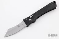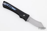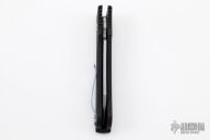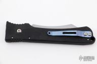 This Roper by Rob Dalton features a bead blasted clip point blade. The handle is comprised of a black G10 frame with lanyard hole in pommel. The anodized titanium pocket clip is positioned for right hand tip up carry. Has some scratches on the clip, otherwise excellent condition.