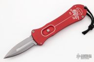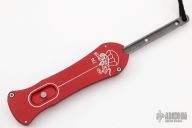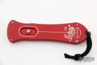 This OTF Auto by Rob Dalton features a double edge bead blast blade. Red anodized aluminum handle. Engraved with the Dalton logo. Black leather lanyard. Excellent condition.