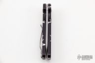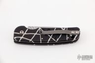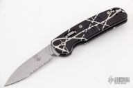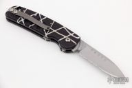 This 07/1 Prototype side opening automatic by Rob Dalton features a bead blasted partially serrated blade. The handle has a black/silver aluminum frame with a tip up bead blasted titanium clip, can be right or left. Has "USA" on frame and "07". Excellent condition.