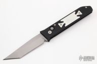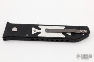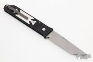 This Jammer Prototype by Rob Dalton features a bead blast chisel ground tanto blade and a black aluminum handle with an aluminum inlay. Bead blast titanium clip, tip up carry. Strong and fast coil-spring opening. Excellent condition. Numbered 080 on frame.