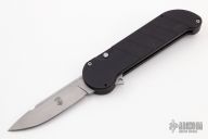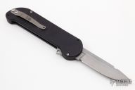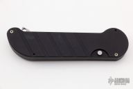 This Kilroy Pro I by Rob Dalton features a bead blast blade and black aluminum frame. Push button opening. Retract the charging tab in the middle of the knife to close. Very powerful opening. Has some scuffs, otherwise excellent condition. Comes with a zippered case.