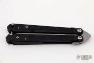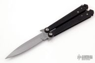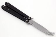 This Wings balisong by Rob Dalton features a bead blast blade and black aluminum handles, has a ball latch at the butt. Locks up tight in both positions. Very hard to find. Excellent condition. Comes with a zippered case.