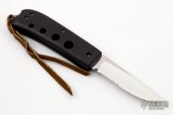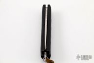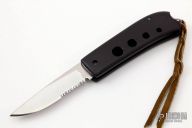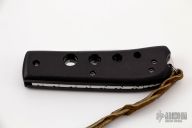 This scale release auto by Mike Whiskers Allen features a mirror polished partially serrated blade with fileworked spine. The handle has black aluminum scales and a fileworked stainless steel backspacer. There is a lanyard hole at the butt. Excellent condition. Nice action, lockup and blade seating. Comes with a zippered case.