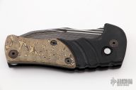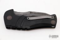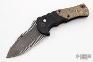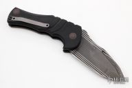 This side opening auto by Mikkel Willumsen features a Damascus blade with fullers near the tip of the blade and notched thumb-rest on spine of handle. The handle has a black G-10 bolster/frame with textured mokume scale on front side, bead blasted stainless steel clip, tip up carry. Has some light scratches, otherwise excellent condition.