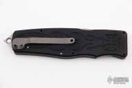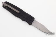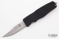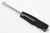 This Prototype Safe-to-Carry (STC) Asp OTF by Rob Dalton opens by pressing forward on the safety and down on the bar on the handle spine. The knife closes by pressing the locking mechanism on the opposite side and pulling the charging handle on the rear half way then pressing the safety forward and the release bar down at the same time while pulling the charging handle the rest of the way. Very strong and fast opening. The blade is a clip point and is bead blasted. The handle is black aluminum with a tip down bead blasted titanium clip. Has a couple light scuffs, otherwise excellent condition.