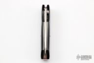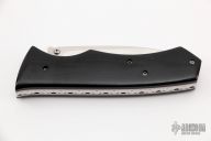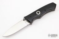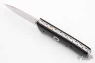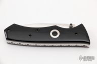 This Mini Bulldog D/A auto by Nate Clark features a mirror polished drop point blade with fileworked spine and a single black G-10 inlaid thumbstud with knurling. The handle has black G-10 scales, polished titanium liners with jeweled interiors, fileworked stainless steel backspacer, black G-10 inlaid stainless steel push button. Nice action, lockup, detent and blade seating. Excellent condition.