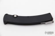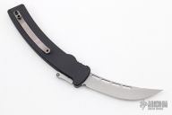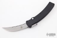 This Scorpion by Rob Dalton features a bead blast blade and black aluminum handle. Fires via push button and retracts by holding the button and moving the slider on the side of the knife. Excellent condition.