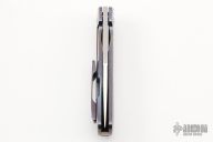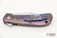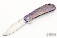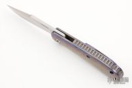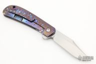 This Lannys Clip flipper from Enrique Pena features a hand rub satin finished blade with flipper. The handle has a MokuTi frame and tip up clip, anodized titanium backspacer. This knife flips well with no wrist action needed. Blade is centered when closed and locks up with no blade play. Comes with nylon zippered case. Excellent condition.