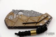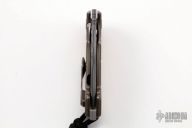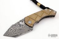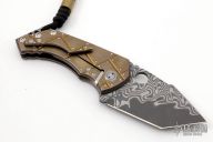 This Titan 3 by Sergey Rogovets features a tanto style San Mai Damascus blade with a thumb hole and notched thumbrest. The handle has a carved, distressed and anodized titanium frame with a matching pocket clip, tip up carry, San Mai backspacer. Damasteel Pivot. Locks up with no play, has a lockface insert. S/N 1811.  Excellent Condition.