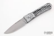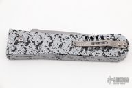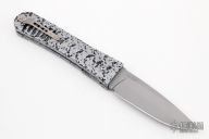 This Experimental Packer by Rob Dalton features a bead blast finished drop point blade, and a splash anodized and milled aluminum frame. Satin titanium tip up clip. Strong and fast coil spring opening. The release button is on the edge of the frame, and pushing it towards the blade will open the knife.  S/N #041 Excellent condition.
