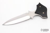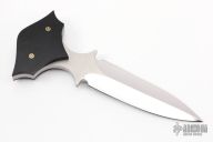 This One Off Push Dagger by Burn Knives features a mirror polished double edged blade with satin flats, .257" blade stock and 1.222" blade depth, full tang construction with black paper micarta scales and mosaic pins. Excellent condition. This knife is not marked but has been verified as a Burn Knife. Comes with a COA dated 12-14-17