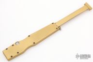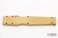 This Ranger OTF Single Action Automatic by Rob Dalton features a bead blasted spear point partially serrated blade. The handle is comprised of gold aluminum with push button and gold charging handle on pommel. Has a few scuffs, otherwise excellent condition.