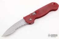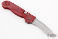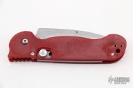 The Drifter by Rob Dalton features a bead blasted recurve partially serrated blade, textured red G10 frame, has holes for a tip up reversible clip, but no clip. Fires strong. Perfect function. Notched thumbrest. The blade is labeled *PROTO*. Has been used and sharpened, has scuffs and scratches, has some oxidation on the blade, fair condition.