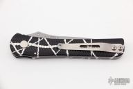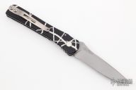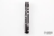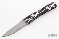This linerlock folder by Rob Dalton features a bead blasted partially serrated blade and an anodized aluminum frame. Titanium clip, tip up carry. Smooth action. Nice detent, and lockup. Very nice work. Excellent condition. #093