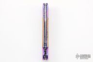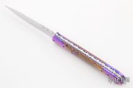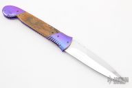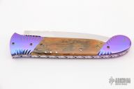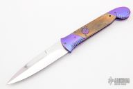 This Gambler Auto by Rainy Vallotton features a mirror polished spear point blade with false top edge and fileworked blade spine. The handle has anodized and fluted titanium bolsters, front and rear, mammoth ivory scales, fileworked and anodized titanium liners, and a fileworked stainless steel backspacer. Nice action and blade seating. Comes with a zippered case. Excellent condition. Marked "Prototype #1" on the blade.