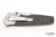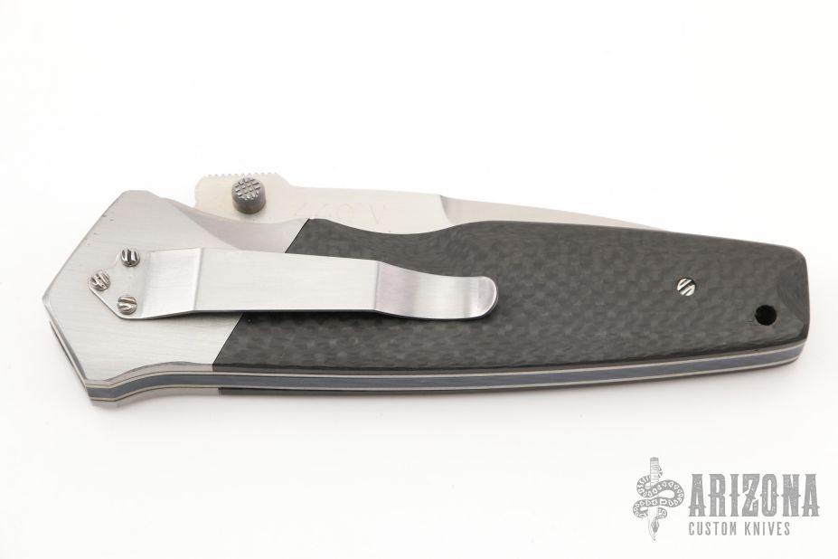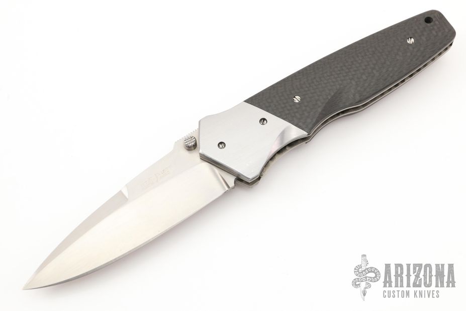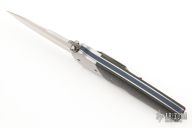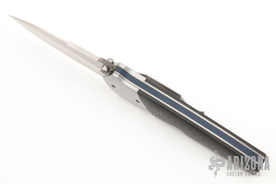 This Scale Release Automatic by Butch Vallotton features a hand rub satin finished spear point blade with swedge, notched thumbrest and dual thumb studs. The handle is comprised of stainless steel bolsters and carbon fiber scales over jeweled titanium liners and a black/blue G10 backspacer. Stainless steel tip down clip. Scratches/scuffs on blade and bolsters and blade is off center a bit, otherwise good condition. Comes with original box.