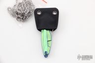 This Hummingbird Flipper by Rike Knife features a Damasteel blade with thumbhole, notched thumbrest and flipper. The handle has an anodized and milled titanium frame with matching tip up clip and a blue anodized titanium backspacer, has stainless lockface insert. Nice detent, lockup and blade seating. Rides on caged bearings. Comes with original box and neck sheath. Excellent condition.
