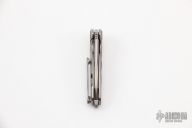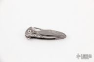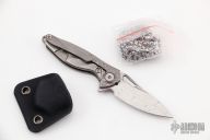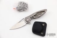 This Hummingbird Flipper by Rike Knife features a Damasteel blade with thumbhole, notched thumbrest and flipper. The handle has a bead blasted and milled titanium frame with matching tip up clip and titanium backspacer, has stainless lockface insert. Nice detent, lockup and blade seating. Rides on caged bearings. Comes with original box and neck sheath. Excellent condition.