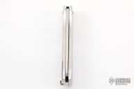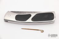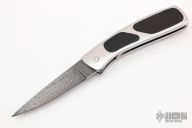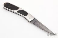 This Baron Interframe Auto from Chuck Stewart features a drop point Jerry Rados Damascus blade. The handle is comprised of stainless steel frame with tortoise shell inlays, has a toothpick in the butt fo the frame. Knife opens and closes using the Stewart Lock Release system. There are scuffs/scratches on frame, but otherwise good condition.