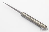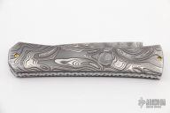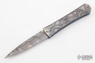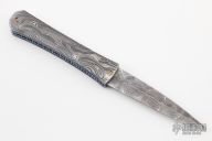 This side opening auto by Rainy Vallotton features a Damascus blade with a false top edge. The handle has Damascus scales, anodized and fileworked titanium liners, and a stainless steel fileworked backspacer. Comes with original box. Excellent condition.