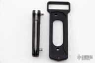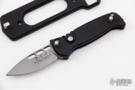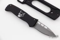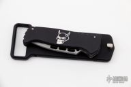 This Belt Buckle by Rob Dalton is made from black aluminum. Attached is a Micro Militia marked PROTO. You can remove it by pulling out the butt of the knife first, then spin it and the front will come out. Bead blasted spear point blade with a black aluminum handle. Excellent condition.