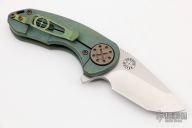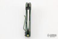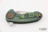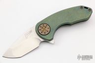 This F3 Compact by Curtiss Knives features a stonewashed, N690 blade with notched thumb rest and flipper. The handle has a tumbled and anodized titanium frame over notched titanium backspacer, matching titanium tip up clip. Smooth and fast opening using a Caged Bearing System. Has a stainless lockface insert. Nice blade seating, detent and lock up. Excellent condition.