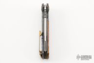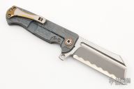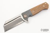 This Mini Cleaver by Andre De Villiers features a two-tone finished cleaver style blade with notched thumbrest and flipper, has polished fullers. The handle has a stonewashed titanium frame with anodized tip up clip with roller, copper frag pattern scale, copper inlay in the anodized titanium backspacer, copper pivot collars, stainless lockface insert with integral overtravel stop, lanyard hole. Rides on bearing, nice detent, lockup and blade seating. Has some scratches, otherwise excellent condition.