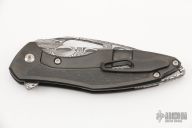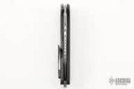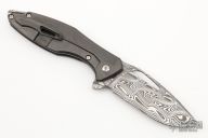 This Arius by Koenig knives features a Thor Pattern Damastee blade with thumbhole and notched flipper. The handle has a DLC coated titanium frame, black carbon quartz front scale with Damasteel underlay, Damasteel backspacer, and tip up DLC titanium clip with hidden screws. Has ceramic bearings and a ceramic detent ball. Nice detent, lockup and blade seating. This knife was the 2019 CCKS open bid. Excellent condition.