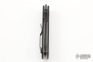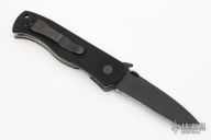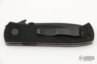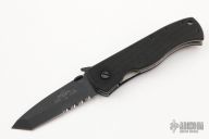 This CQC-7 by Emerson Knives has a tanto chisel ground partially serrated blade with notched thumbrest, wave features and a single thumbstud. Has G-10 scales, titanium liners, barrel spacers, and a tip up black stainless clip. S/N 12374. Nice detent, lockup and blade seating. Excellent Condition.