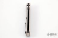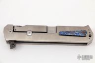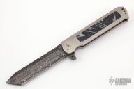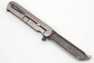 This Slash Sword Flipper by Reese Weiland has a Damascus Tanto blade with flipper, .261" blade stock and 1.373" blade depth. Handle has a satin finished titanium frame with a mokuti tip up clip, satin finished stainless steel backspacer and a stainless lockbar stabilizer, has lanyard hole. The handle has a large Prehistoric Coral inlay. Rides on bearings, nice detent, lockup and blade seating. "RW PROTO" inside backspacer. Comes with cloth case. Excellent Condition.