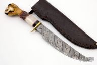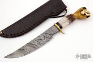 This Camp Knife by JA Lonewolf features a Damascus partially serrated blade with .208" blade stock and 1.868" blade depth, hidden tang construction. The handle has a brass guard, stag grip with carving. Comes with a brown leather sheath. Excellent condition.