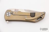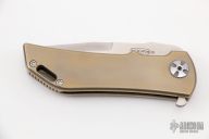 This Dominator Level 3.5 Flat Frame by Darrel Ralph has a satin finished blade with notched thumbrest and flipper. The handle has an anodized titanium frame, backspacer and tip up clip. Runs on bearings, nice detent, lockup and blade seating. Has some scratches, otherwise excellent condition.