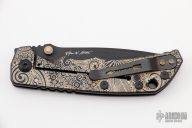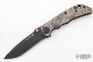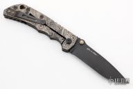 This Harsey framelock folder by Spartan Blades features a black drop point blade with dual thumbstuds and a notched thumbrest. The handle has an anodized titanium frame with a laser engraving a tip up titanium clip and filler tab. Has nice detent, lockup, and blade seating. Excellent condition.